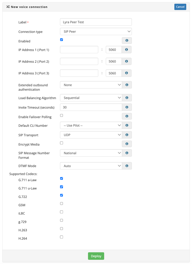 Lyra Peering Trunks can be set up and managed via the Voice Connections page in the 2talk Cloud PBX