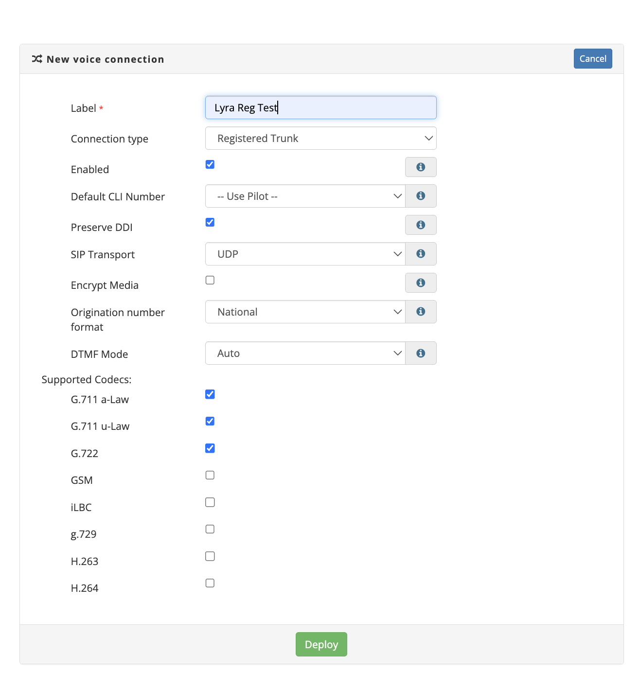 Lyra Registration Trunks can be set up and managed via the Voice Connections page in the 2talk Cloud PBX