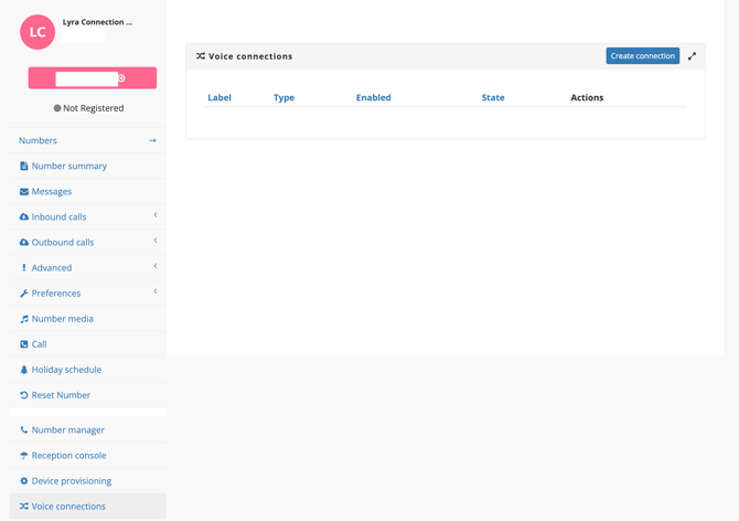 Voice Connections can be found in the left hand Cloud PBX menu. Click to bring up the Voice Connections management page.